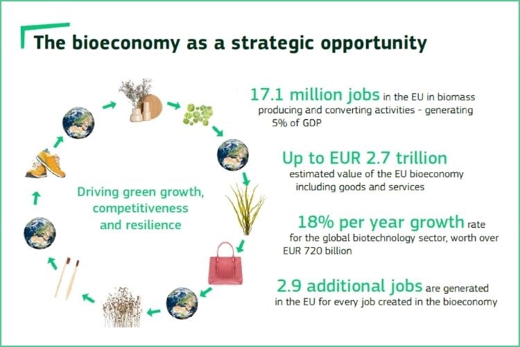 Biogospodarstvo nudi Europi priliku da ojača svoju otpornost, zamijeni materijale i proizvode na bazi fosilnih goriva, stvori radna mjesta i predvodi globalni prelazak na čiste industrije. Ovom novom strategijom EU će podržati aktivnosti koje pružaju održiva praktična rješenja korištenjem bioloških resursa u sektorima kao što su poljoprivreda, šumarstvo, ribarstvo, akvakultura, prerada biomase, bioproizvodnja i biotehnologije. Iskoristit će golemi potencijal tih resursa, znanstvenu izvrsnost i industrijsku bazu te poticati inovacije koje koriste klimi, prirodi i društvu.